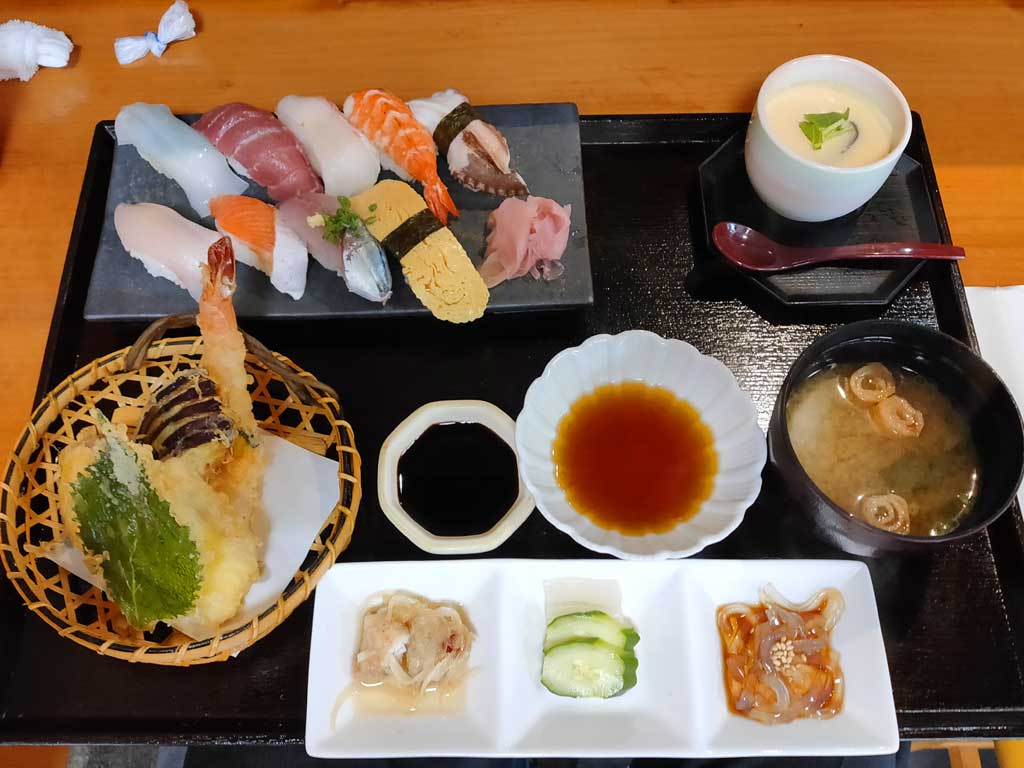 握り御膳2000円税込を注文。他には生姜焼き御膳・天丼御膳各1400円、アジフライ御膳1600円、荒炊き御膳・要御膳各1800円、天麩羅御膳1900円、お造り御膳2200円、特上海鮮丼1800円、極上海鮮丼2800円など。もしかしたらランチでも寿司もやっているのかもしれなくて並にぎり1300円、中にぎり1900円、上にぎり2800円で、呼子のイカも扱っているので遠方からイカを食べに来る人もいるようだ。少し前までは「大衆割烹おかもと」の看板だったが現在は「寿司割烹おかもと」となっている。2025年10月