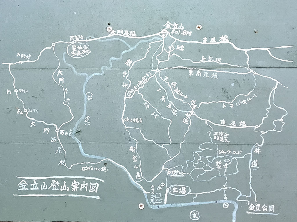 丸太橋の脇に案内図、ルートが沢山ある、今回は一般登山道を登ったつもりが観音沢ルートを登っていた |