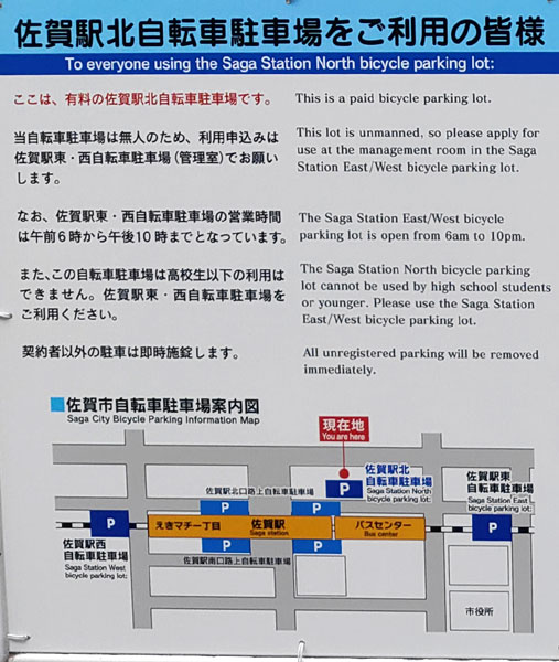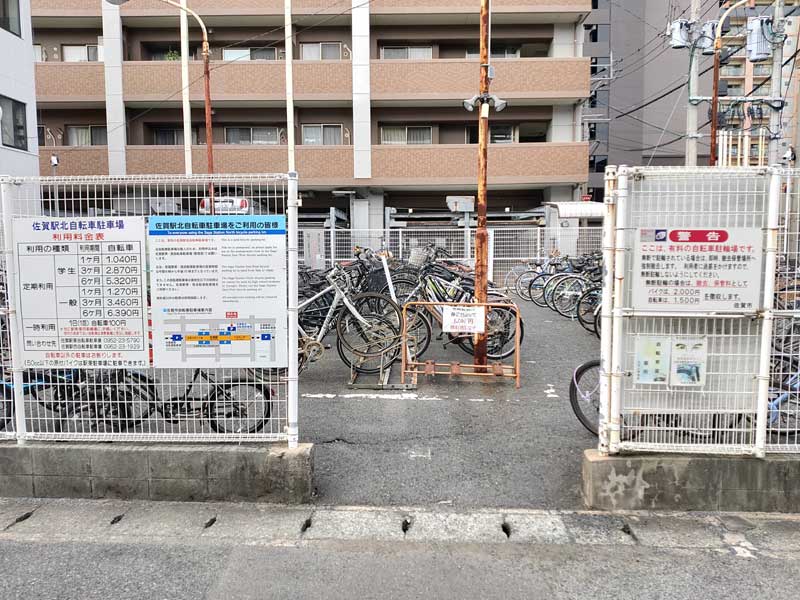 市営の駐輪場でバスセンターの斜め向かいにある。佐賀駅から北方向(佐賀大和インター方向)に通勤する人などが利用するのかも。高校生以下は利用不可と書かれている。係員はいないので手続きは駅西/駅東駐輪場(朝6時~夜10時受付)でする必要がある。定期利用の場合は一般1ヶ月1270円、3ヶ月3460円、6ヶ月6390円(2025年10月現在)施錠はされないので24時間出し入れ可能。