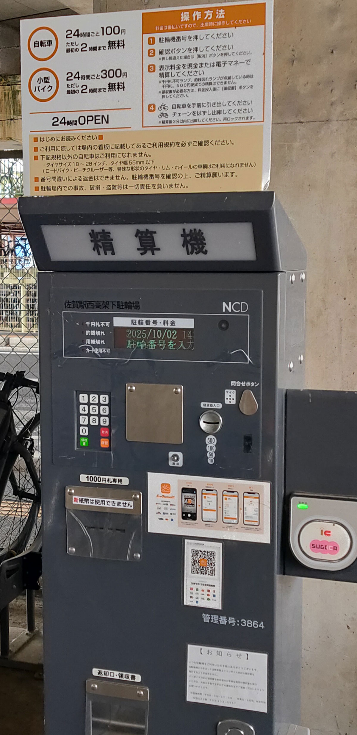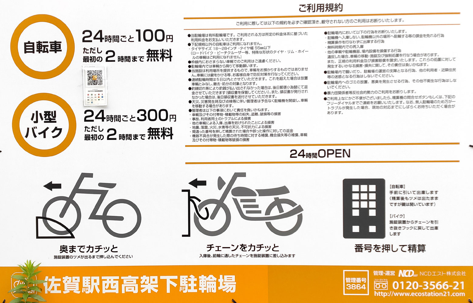 - 料金は後払いで2時間以内は無料だが精算は必要、2時間を超えると24時間自転車100円バイク300円(24時間を超えると加算)